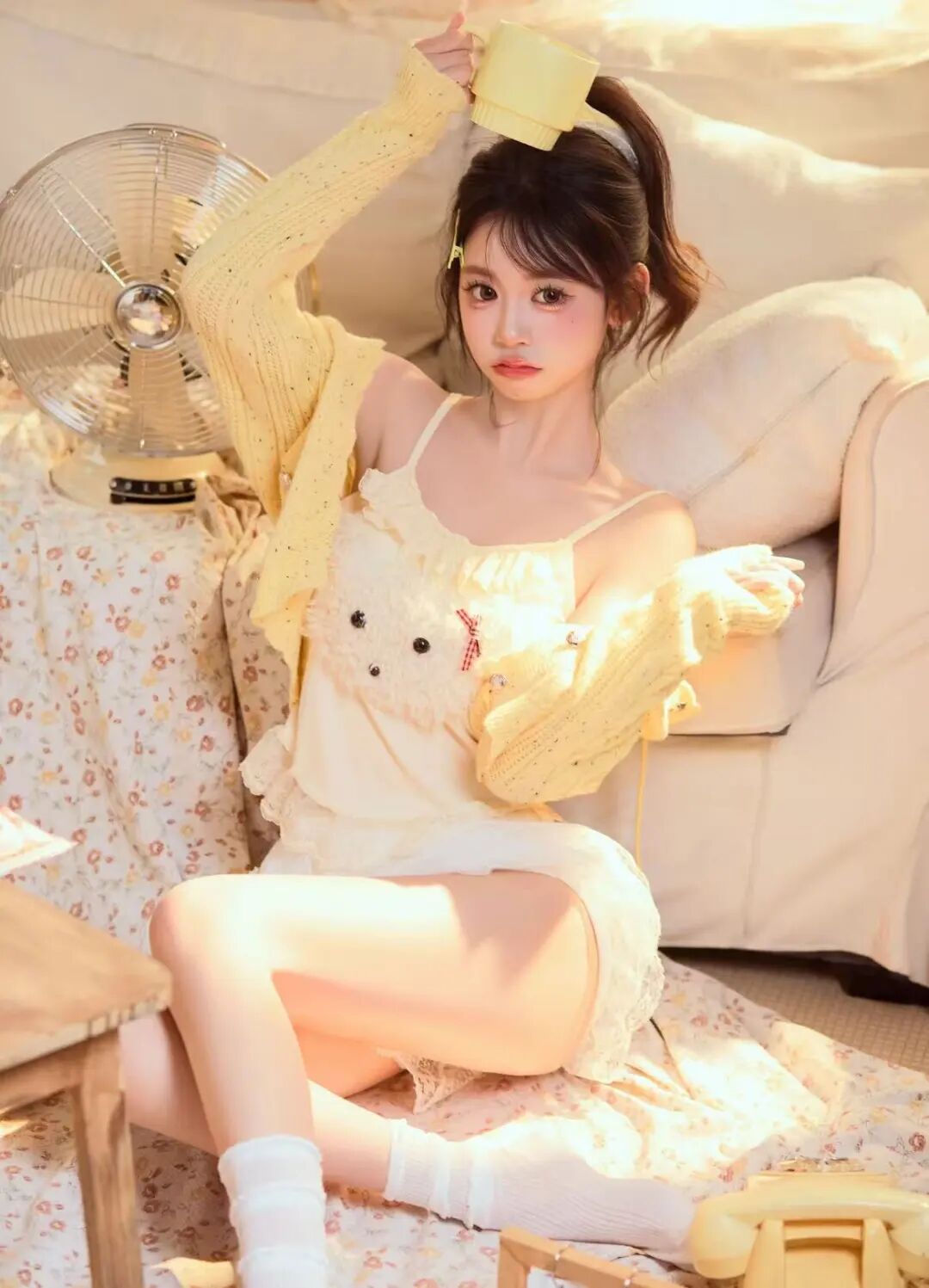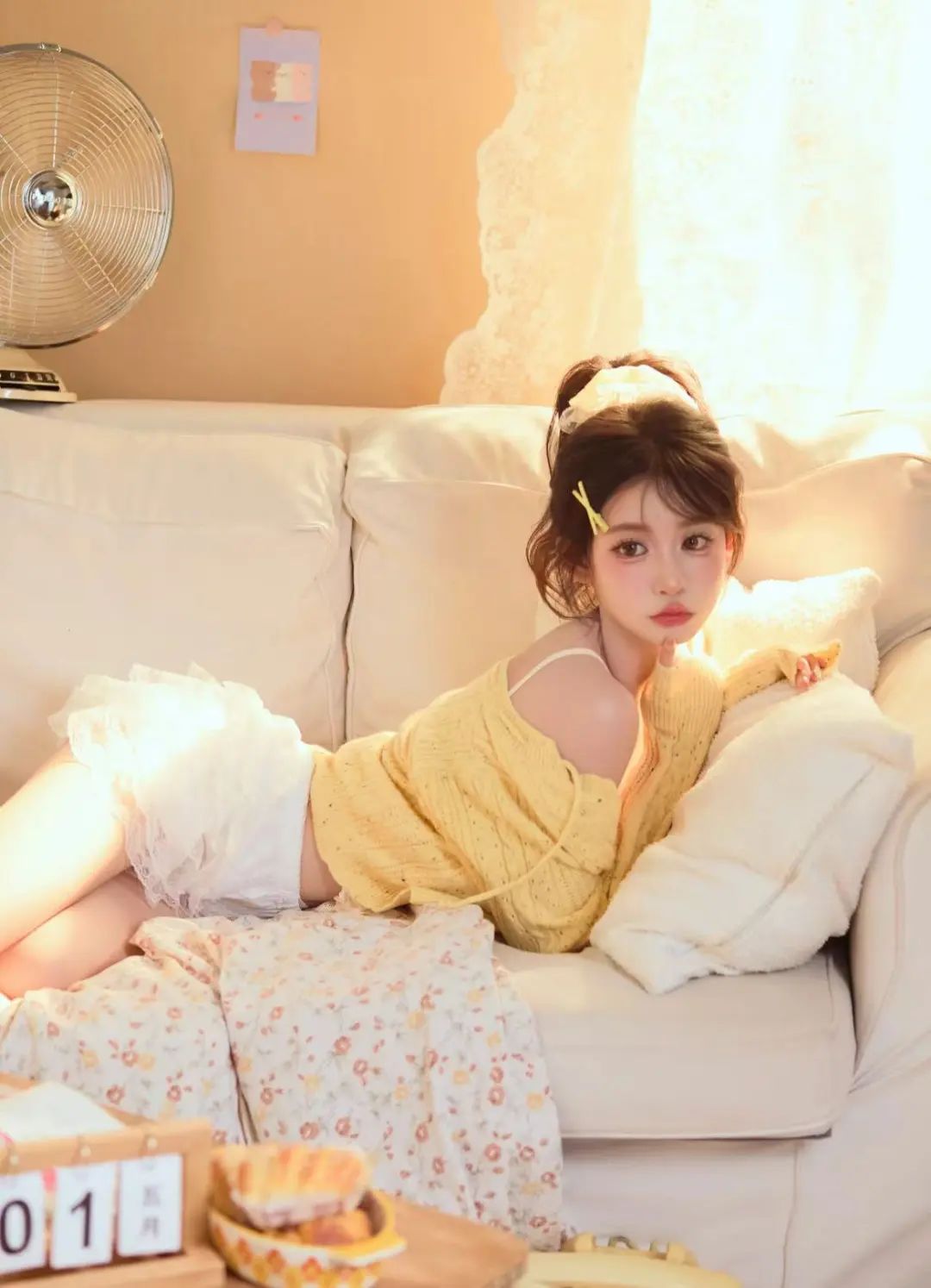 暖黄服装与浅色家具、碎花布搭配,营造温馨复古氛围,双腿弯曲侧放,展现线条