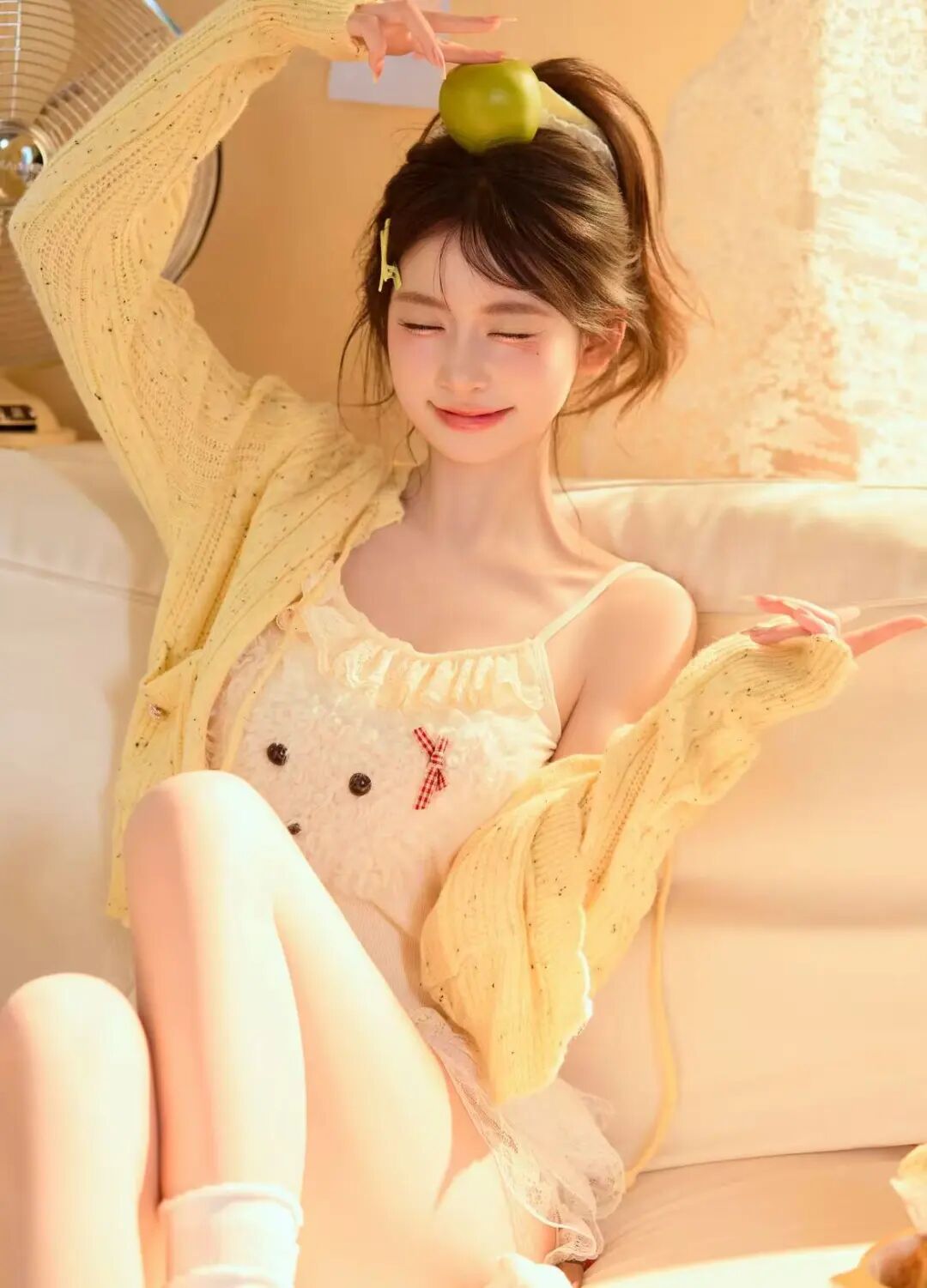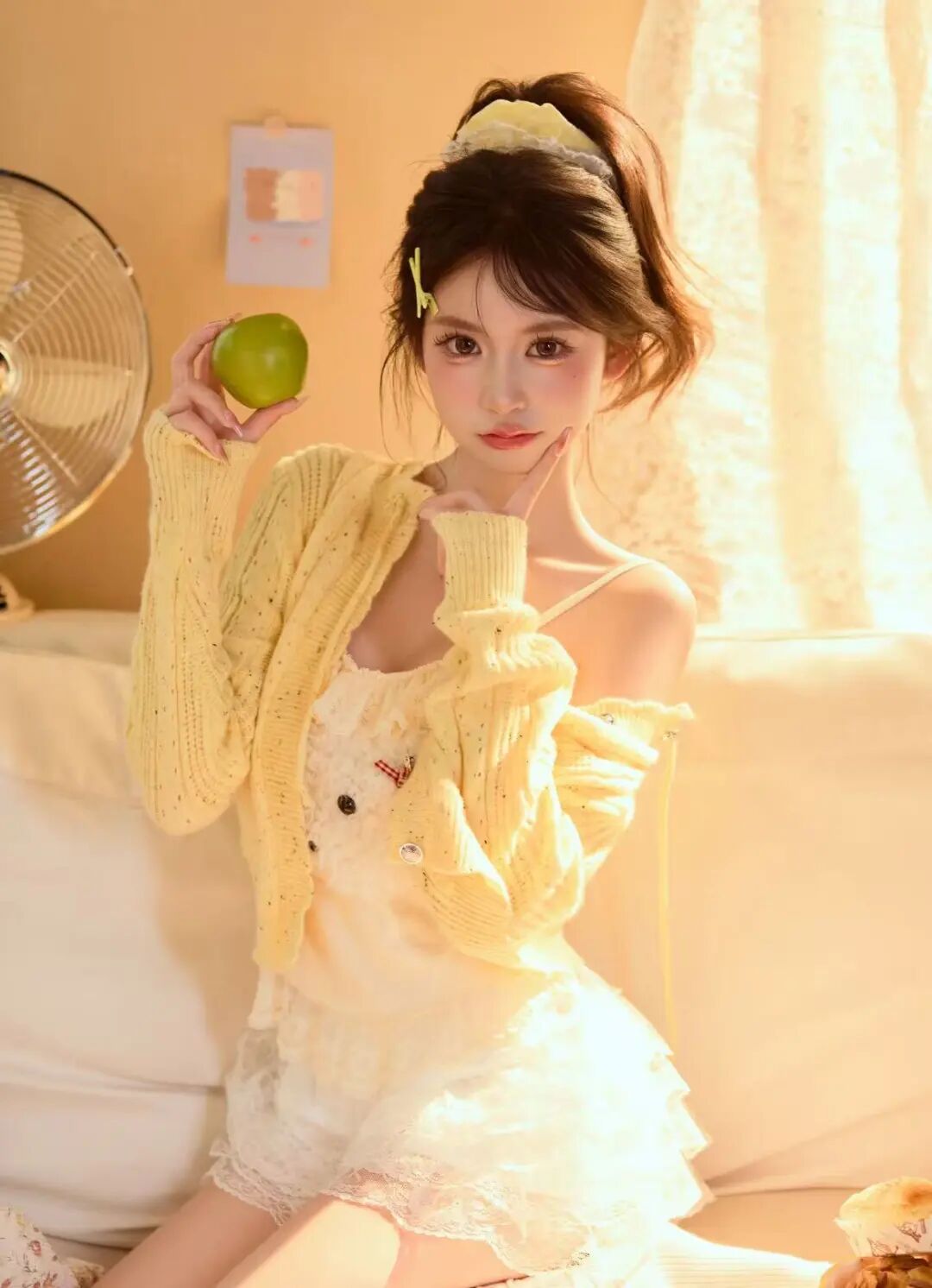 黄色开衫与浅色内搭、蕾丝裙搭配和谐,手中青苹果形成色彩点缀,和背景风扇、墙面装饰共同构建居家场景,丰富视觉层次